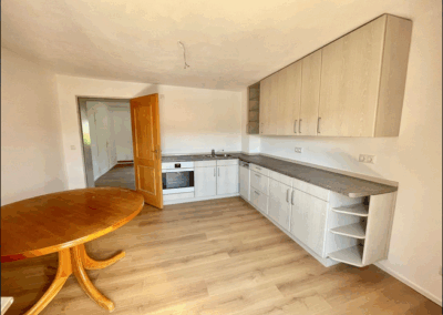 Die Küche ist hell gestaltet und bietet ausreichend Platz zum Kochen und Genießen. Besonders praktisch: Von hier führt eine Tür zu einem kleinen, zweiten Balkon – perfekt für den morgendlichen Kaffee oder frische Kräuter.